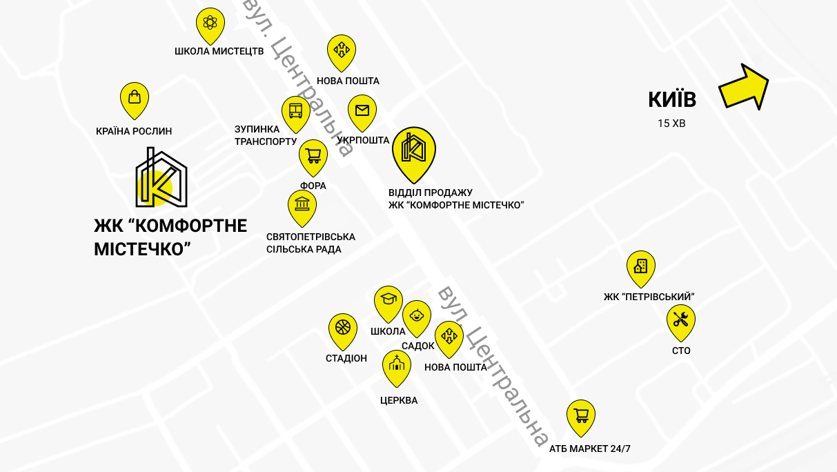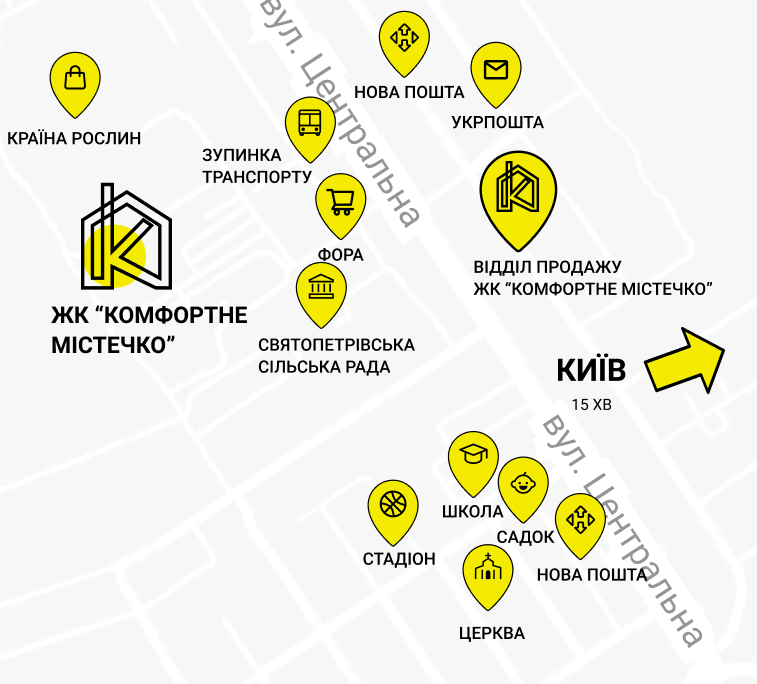 Житловий комплекс "Комфортне містечко" розташований в центрі мальовничого села Святопетрівське, що знаходиться в 15 хвилинах їзди від Києва.